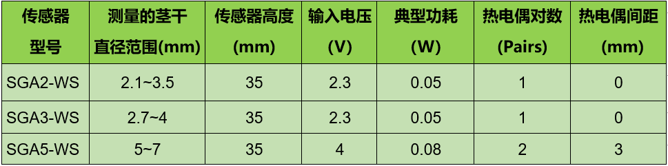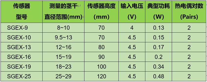 可測量直徑范圍在2.1~7mm之間的莖干,適用于莖干粗細比較均勻的植物,測量時需要將整個傳感器包裹在植物莖干上。型號如下: