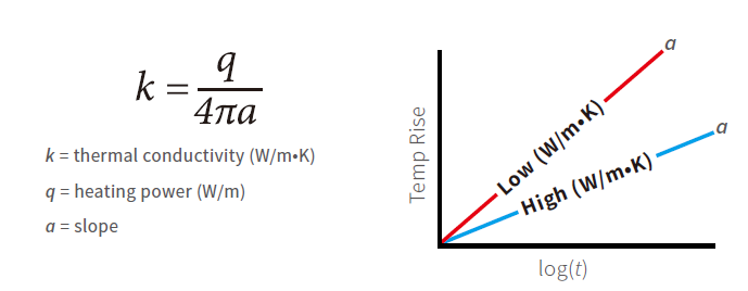 探針傳感器由一根較細的加熱線和溫度傳感器組成,溫度傳感器密封在長度為100mm的不銹鋼管中(50mm探針可選)。測量時,傳感器被完全插入待測的樣品中,采用恒流源(Q)將熱量傳遞到樣品,并在一定時間內(nèi)記錄溫度的上升。利用溫度與時間對數(shù)的斜率(A) ,計算導熱系數(shù)(K)。熱導率越高,斜率越低。對于導熱系數(shù)較低的材料,則斜率較高。